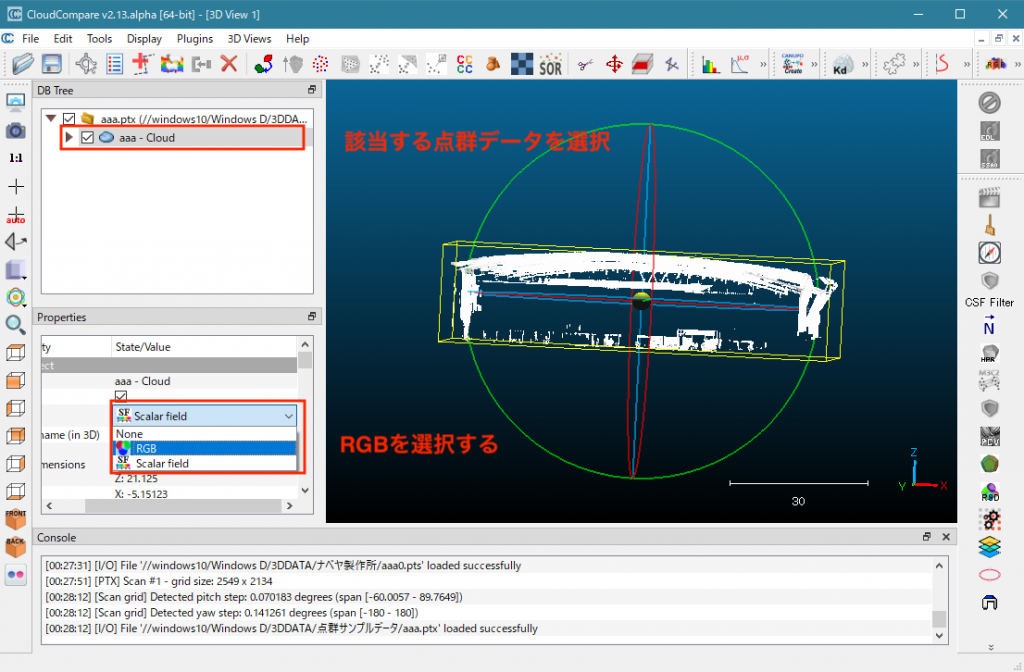 操作対象の点群データをDB TReeから選択し、操作しやすいように表示色をRGBに選択スします。