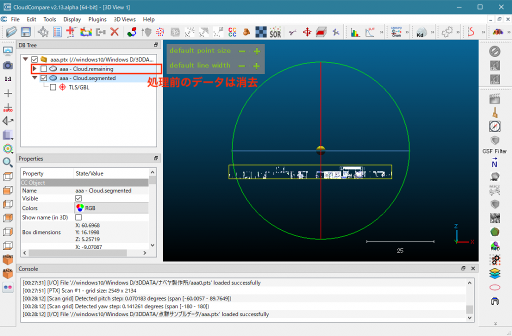 変換後、新しい点群で生成されるので、変換前のデータは右クリックで表示されるポップメニューからDeleteを選択して消します。