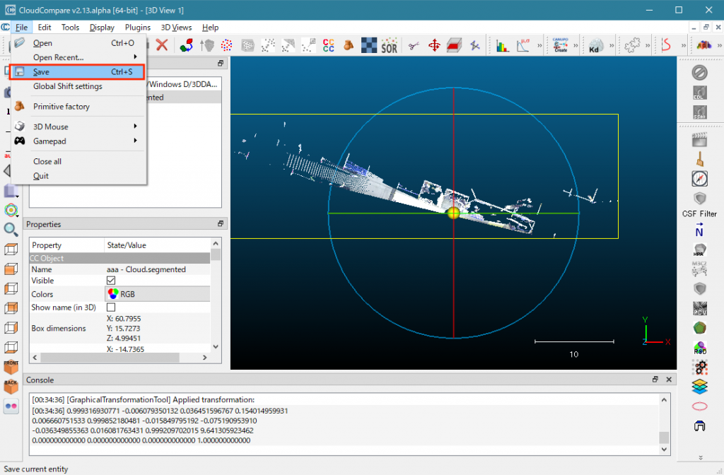 CloudCompareのFileメニューからSaveを選択します。